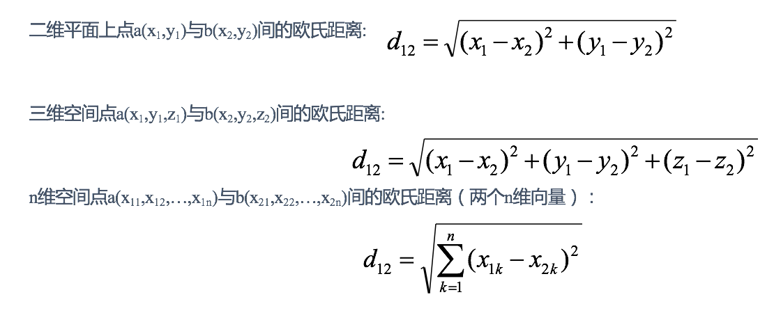 欧氏距离是最容易直观理解的距离度量方法,我们小学、初中和高中接触到的两个点在空间中的距离一般都是指欧氏距离。