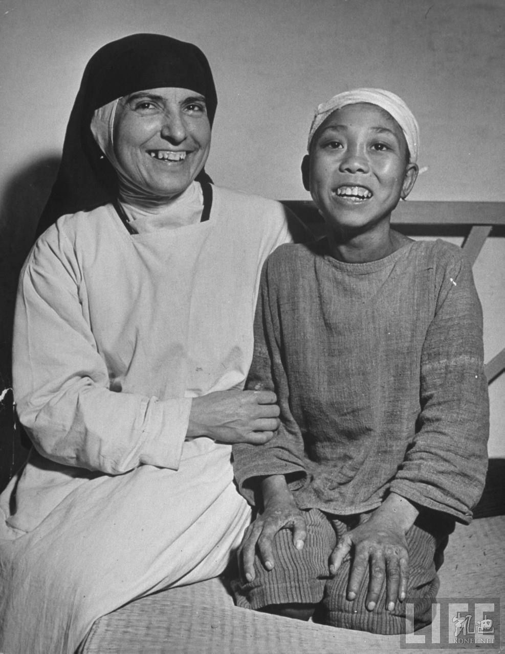 1946年5月,湖南衡阳。衡阳是二战被日军毁灭的城市,这个衡阳女孩因饥荒差一点饿死,她在送往医院六天后获救,这是和修女一起合影,他脸上露出笑容。.jpg
