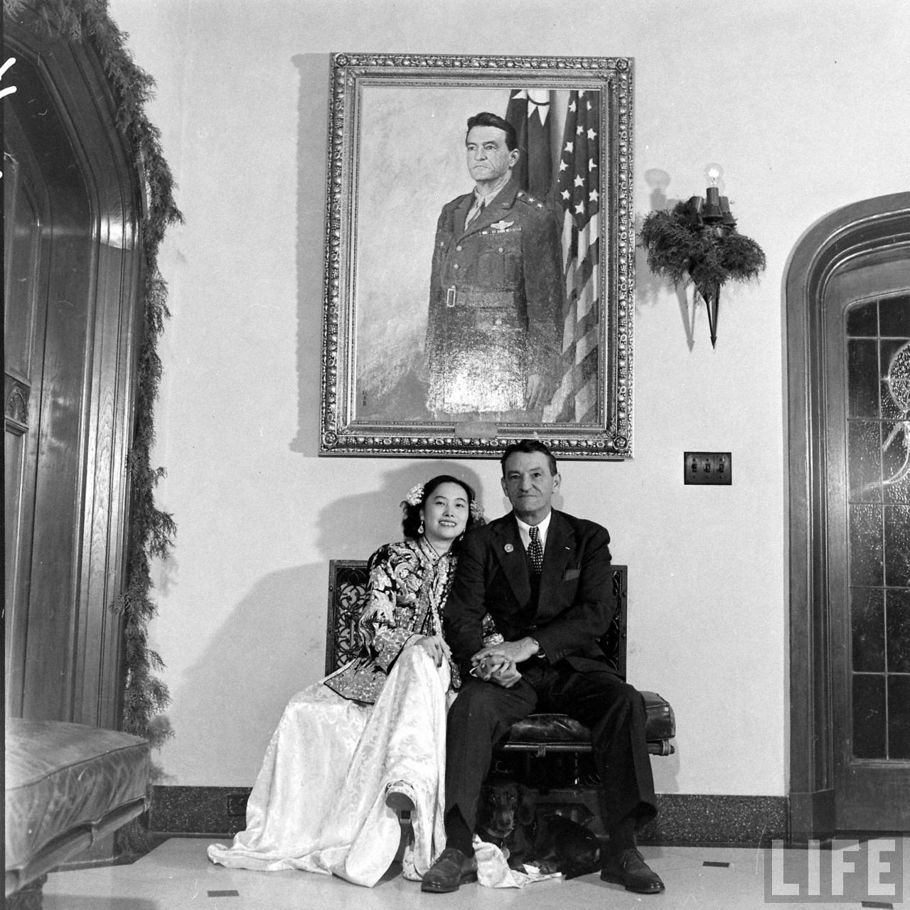 1947年,上海。陈纳德与陈香梅的婚礼。中国人民的真挚朋友陈纳德将军戎马一生为中国人民的抗日战争做出了巨大贡献。宽大的起居室正中墙壁上挂着陈纳德将军身着戎装的巨幅油画像,所有的壁灯都点缀着青翠的松柏枝叶,醒目的是由一千朵白色菊花装饰的大花钟,垂悬于天花板下,清新又繁茂。厅堂和走廊,则摆满了亲友们送的艳丽的花篮花束,除了这铺天盖地的花海,婚礼不见一丝奢华。.jpg