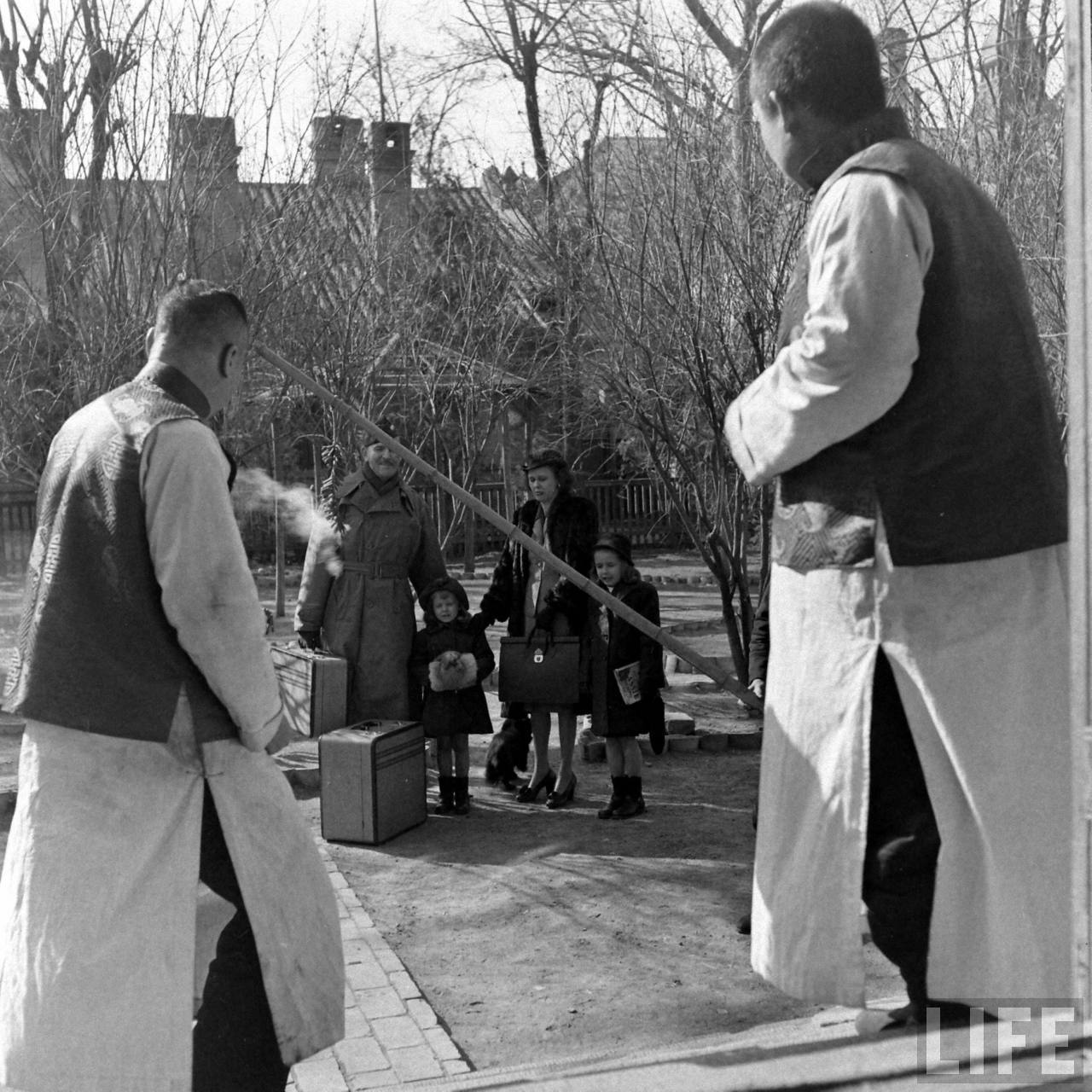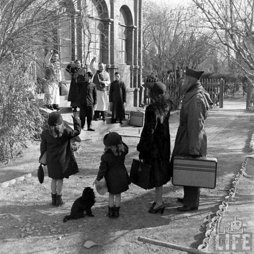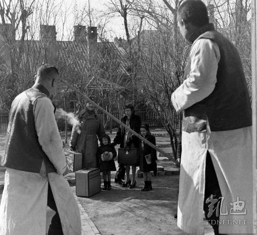 1947年,北平。这是军调处撤离中国,一家美国人在协和医院驻地,他们的中国朋友按传统燃放鞭炮为他们送行。.jpg
