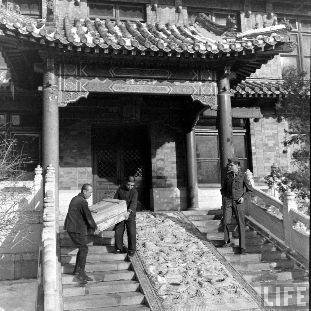 1947年,北平。美国杜鲁门政府停止支持中华民国,军事调停处执行部美方人员撤离北平,此后,中国内战格局改变。这是军调处美方驻地协和医院,中国工人在帮助搬运物资。.jpg