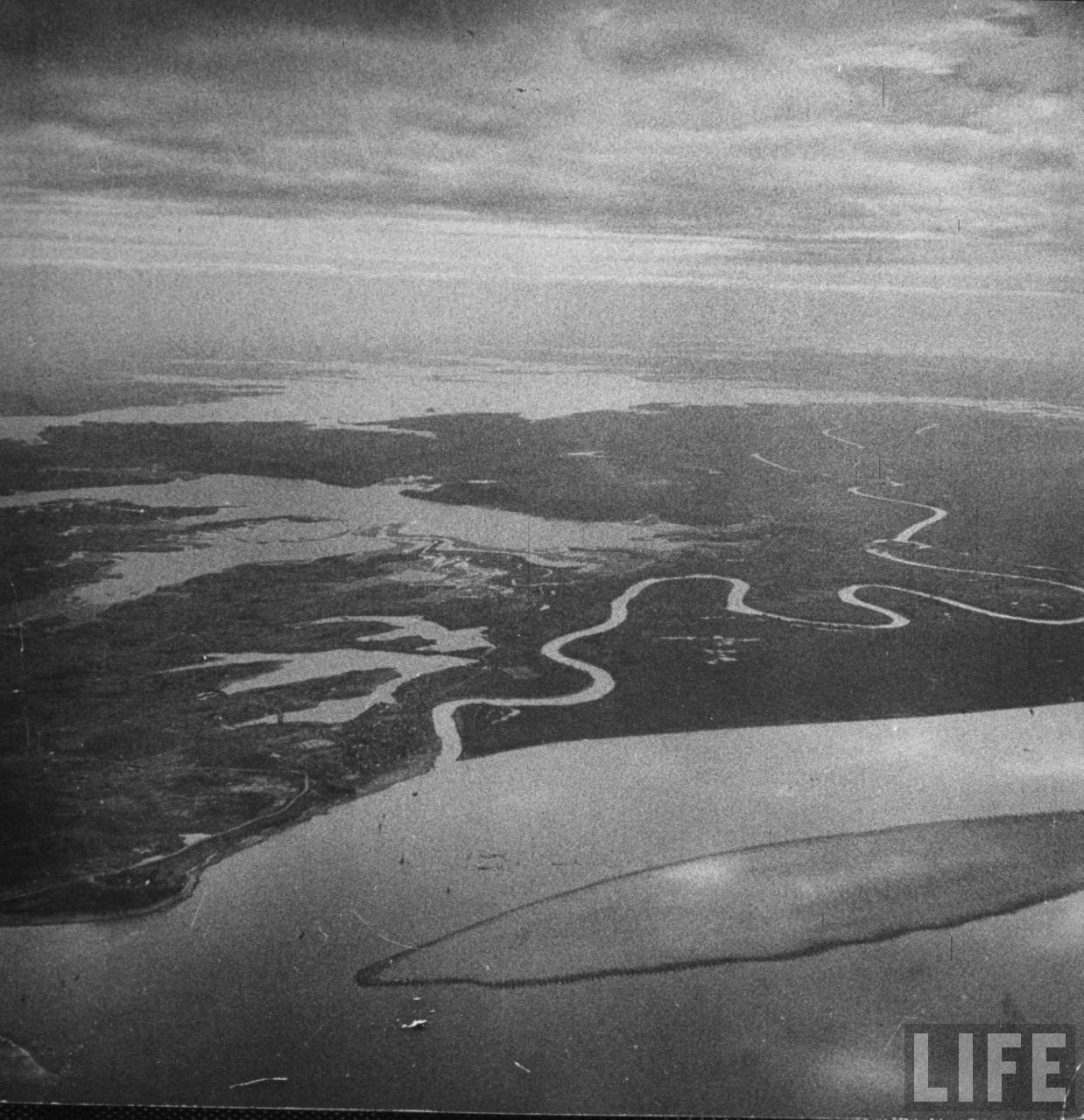 1945年12月,汉口。扬子江面泛滥的洪水的鸟瞰图,汉口周围数百平方英里的土地是中国最富庶的地区之一,这里出产高价值的大米和鱼类,但由于在日本占领时期扬子江堤防缺乏维护,造成洪水泛滥,这些低洼地区的水稻田已经不复存在。1.jpg