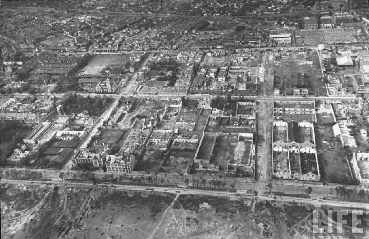1945年,汉口。成片的房屋都是废墟,它们是在二战中被日军空袭摧毁的。与伦敦大空战齐名的武汉大空战发生在1937~1938年。尽管当时中国空军的飞机性能和数量远远不敌日本,但年轻的中国空军沉重地打击了日军的嚣张气焰,粉碎了日本空军不可战胜的神话。汉口是这次空战的中心城市,它现在急需重建。.jpg