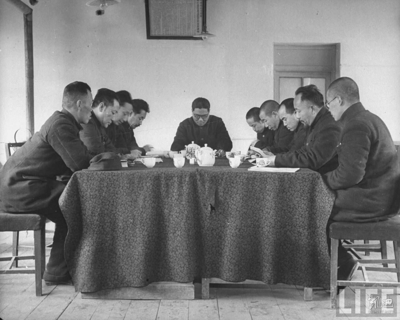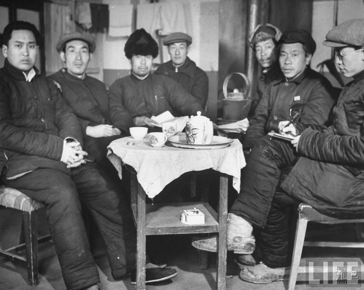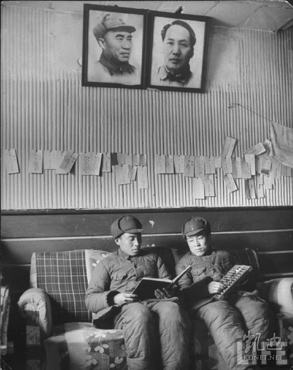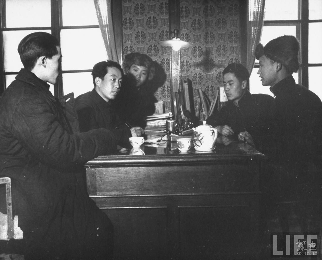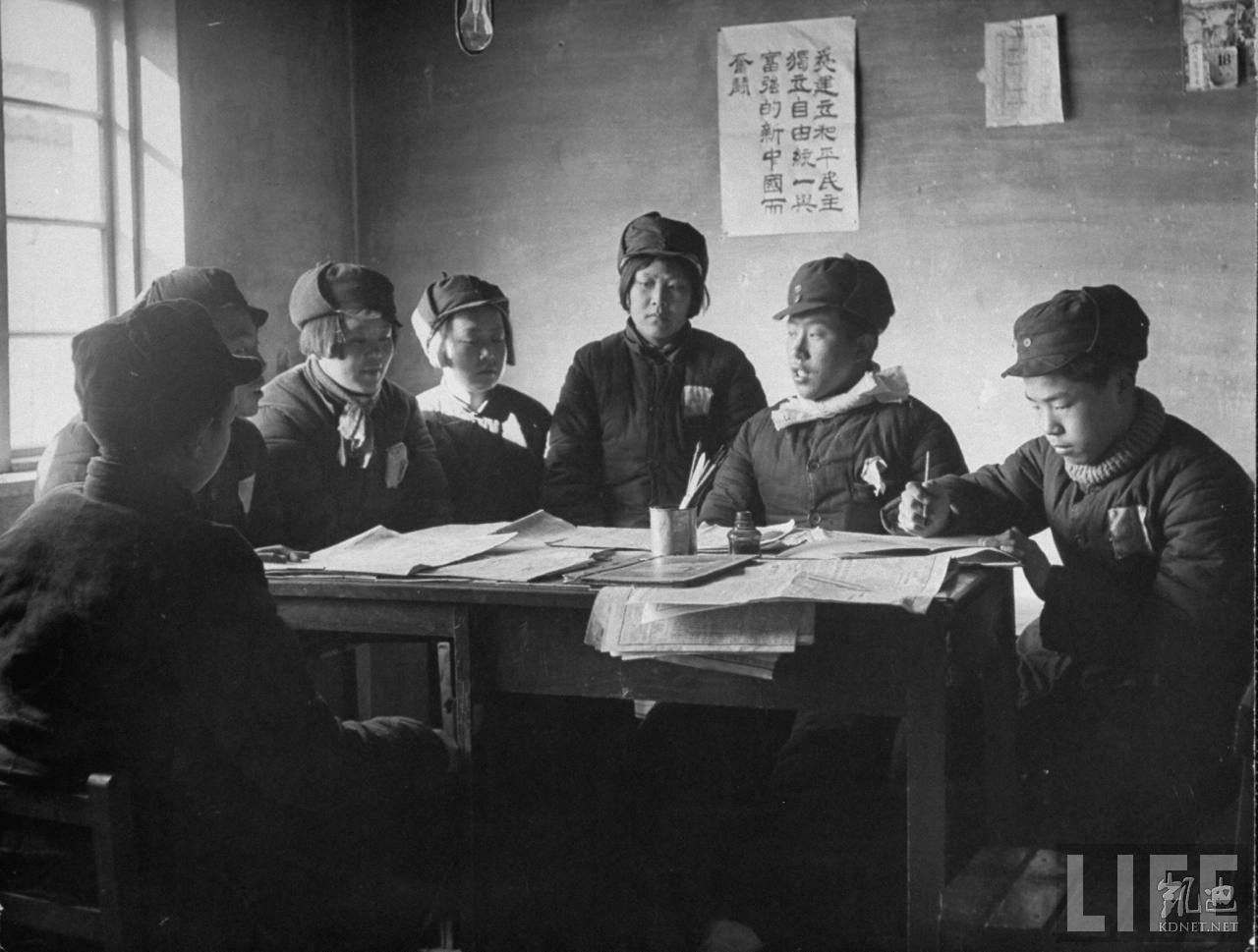 1946年4月,张家口。共产党办的华北联合大学学生们讨论国家政治和时事,后面的标语上写着:为建立和平民主独立自由统一与富强的新中国而奋斗。.jpg