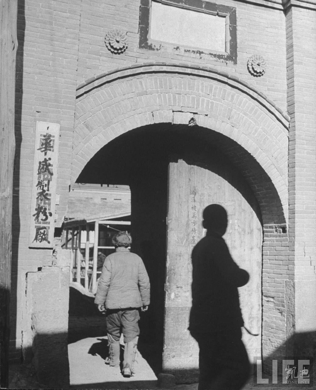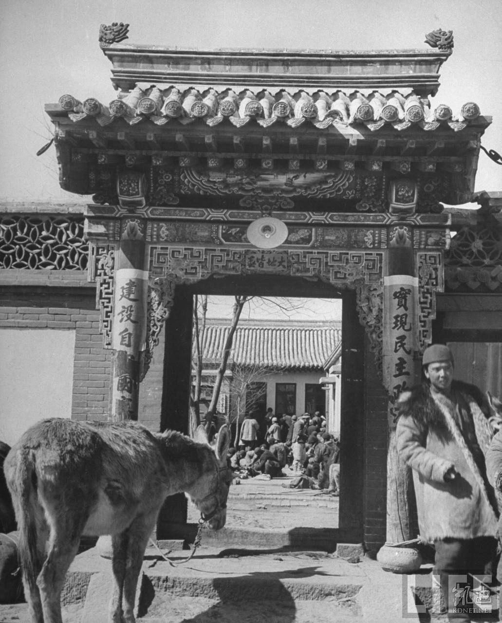 1946年4月,张家口。一个典型当地人的打扮,他穿着羊皮袄,带着帽子,牵着骡子来到这个古老院落的门口,里面还有许多当地人,这里是盐业公司。.jpg