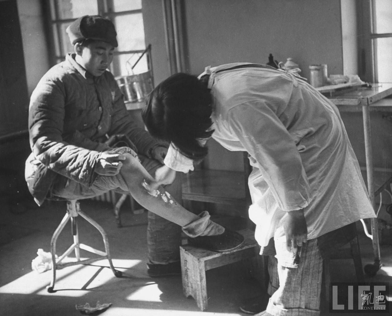 1946年4月,张家口。一家中国医院内一位士兵正接受治疗,护士在检查他的左腿。.jpg