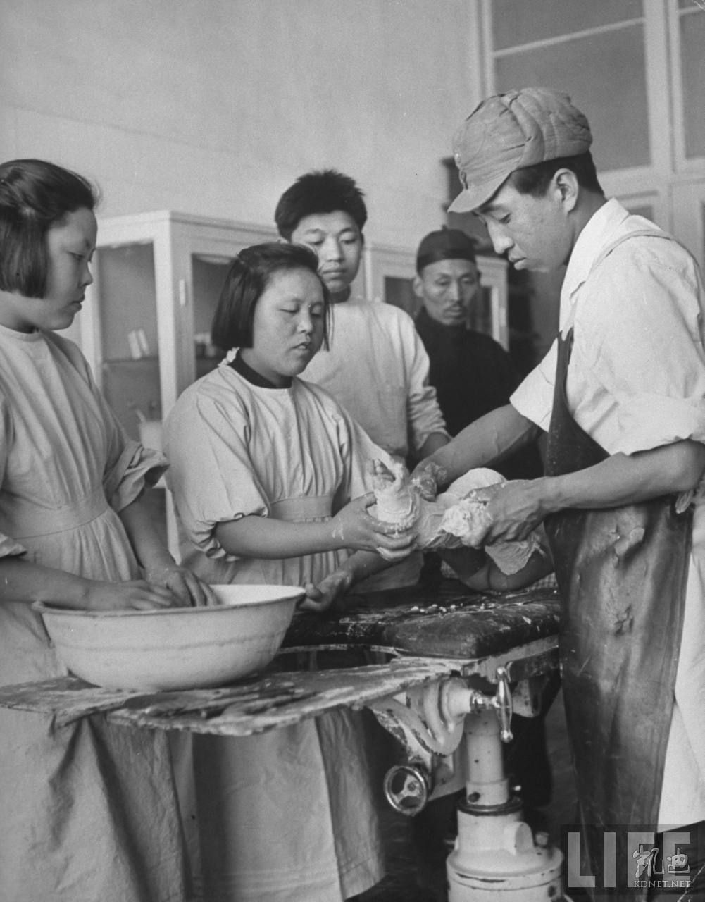 1946年4月,张家口。华盛制粉厂院落内,华北联合大学代表正在检查面粉质量。.jpg