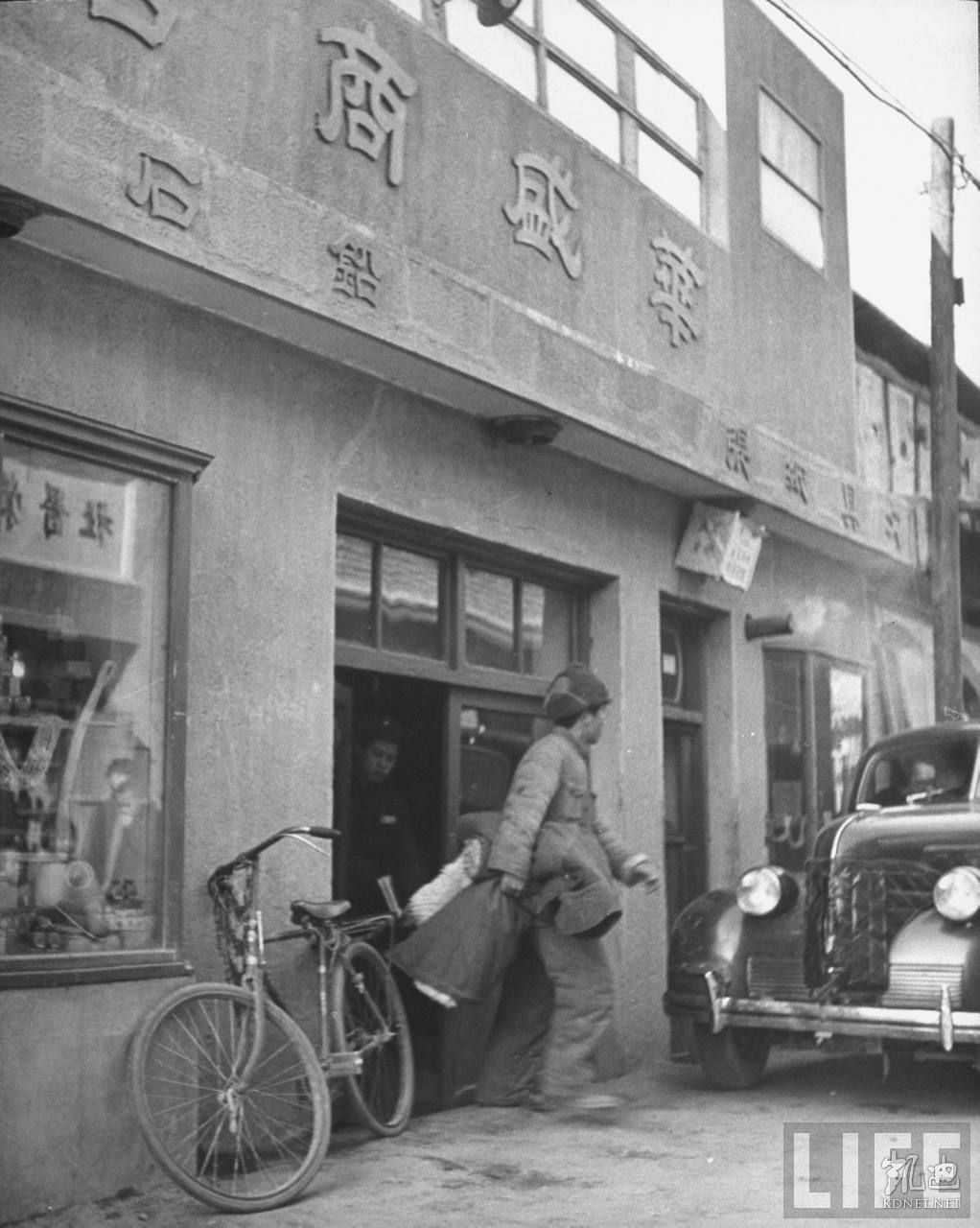 1946年4月,张家口。一家名为华盛商号的商店,两个共产党军人在门口,这家商店主营文具,是为华北联合大学开的专门商店,这个大学是当时共产党办的最高教育机构。.jpg