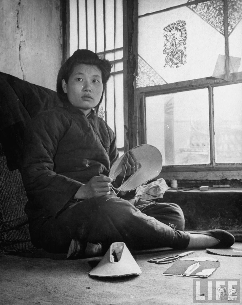 1946年4月,张家口。从良的妓女坐在剪纸窗前纳鞋底,共产党地区开始禁止卖淫嫖娼。.jpg
