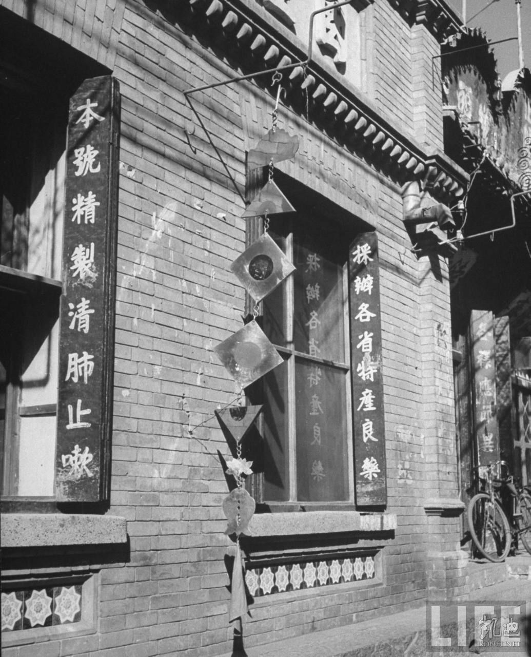 1946年4月,张家口。六块铜牌悬挂在窗外,表示这是一家中药铺。.jpg