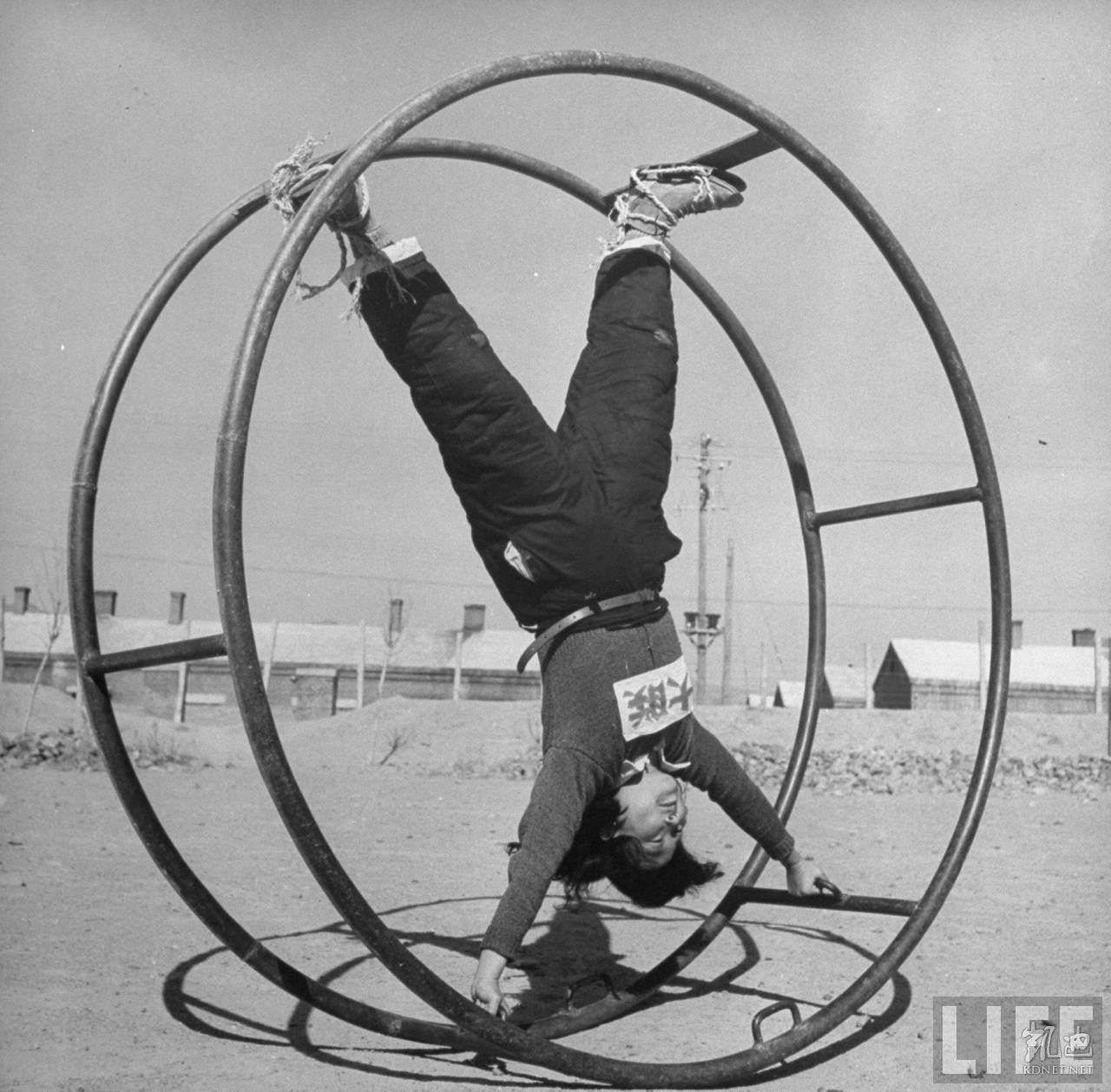 1946年4月,张家口。共产党办的华北联合大学女学生在体育课上转动大铁圈。.jpg