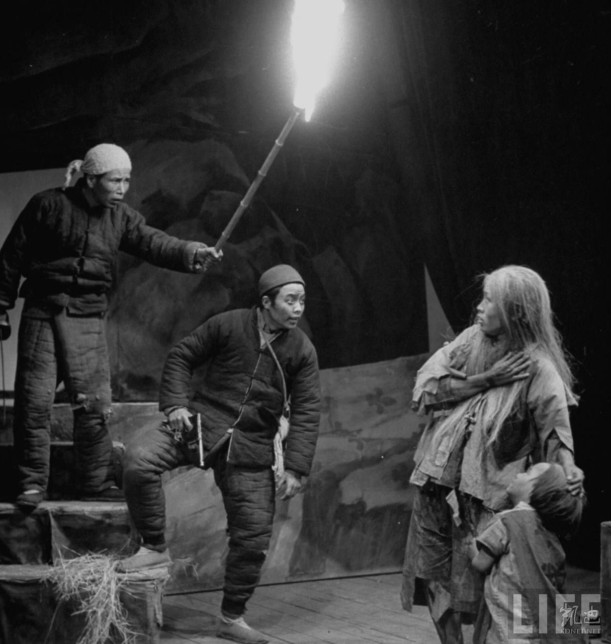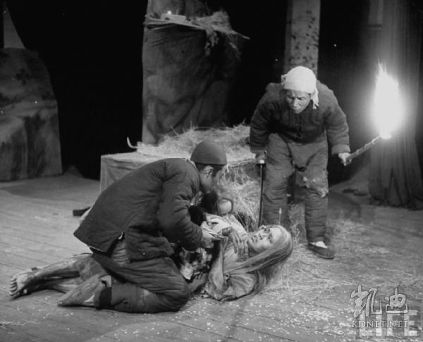 1946年4月,张家口。共产党办的华北联合大学学生们在表演戏剧《白毛女》,这出戏的内容是讲述阶级斗争,这是共产党为了取得政权而极力宣扬的教义。喜儿带着女儿逃进大山当野人成了白毛女,她的初恋情人大春(中)参加共产党游击队回到家乡在深山山洞里面找到了她。.jpg