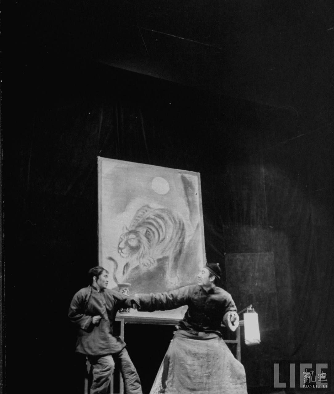 1946年4月,张家口。共产党办的华北联合大学学生们在表演戏剧《白毛女》,这出戏的内容是讲述阶级斗争,这是共产党为了取得政权而极力宣扬的教义。这是剧中两个人物形象,一个叫“喜儿”,是杨白劳的女儿,因欠租被迫卖给地主黄世仁(右)当丫鬟并被强奸,这是黄世仁准备强奸她之前凶恶的样子。.jpg