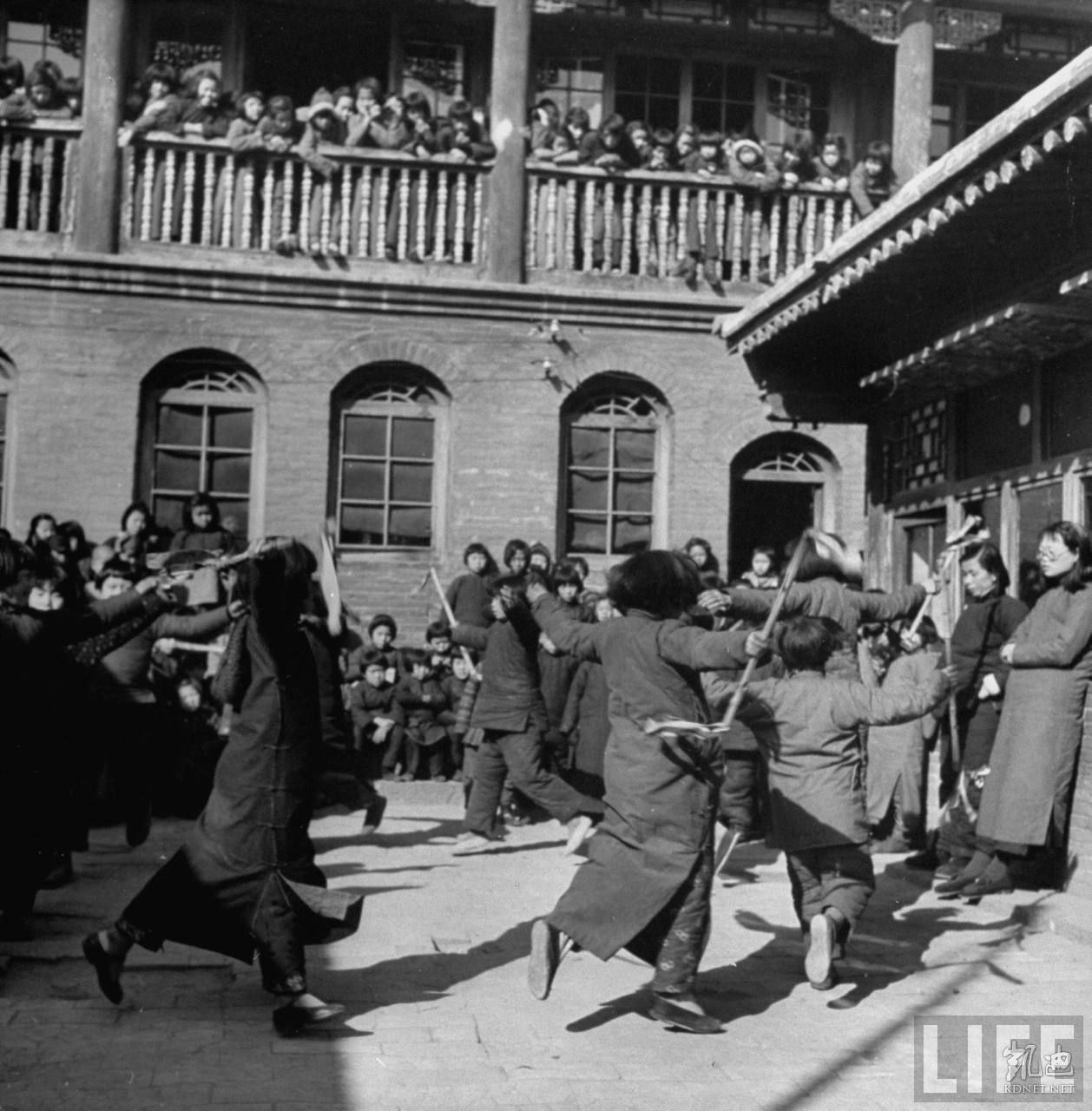 1946年4月,张家口。共产党晋察冀军区大院内,小学生在表演中国传统戏剧”霸王鞭“,围观的人群。.jpg
