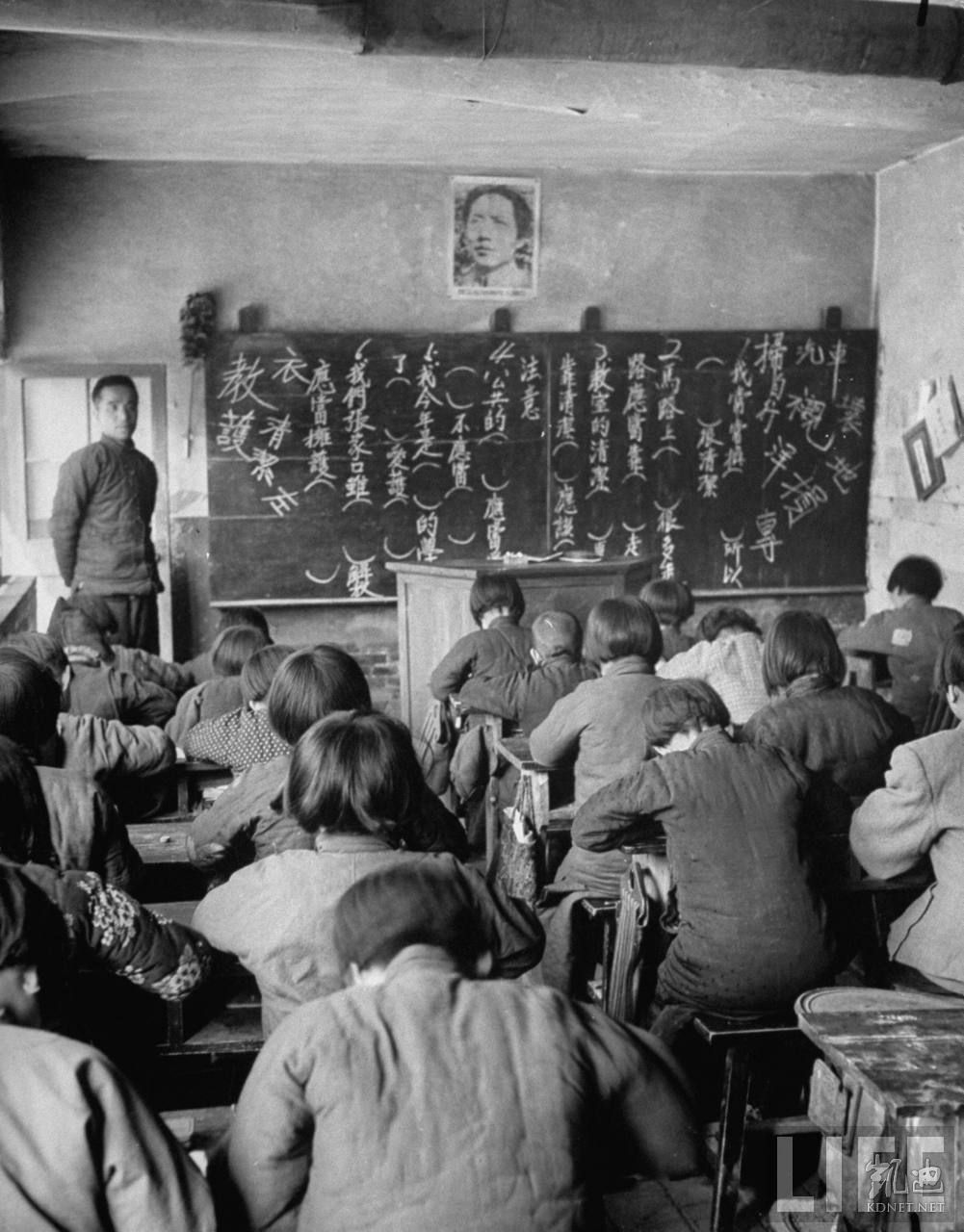 1946年4月,张家口。共产党晋察冀军区大院内,小学课堂,黑板墙上是毛泽东画像,黑板上的文字是填空题,内容是教育小学生们拥护共产党的领导。.jpg