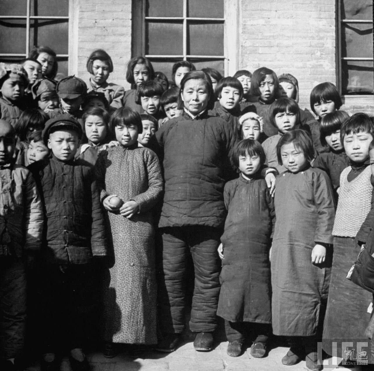 1946年4月,张家口。共产党晋察冀军区大院内,教师和小学生合影,这是共产党地区最好的小学。.jpg
