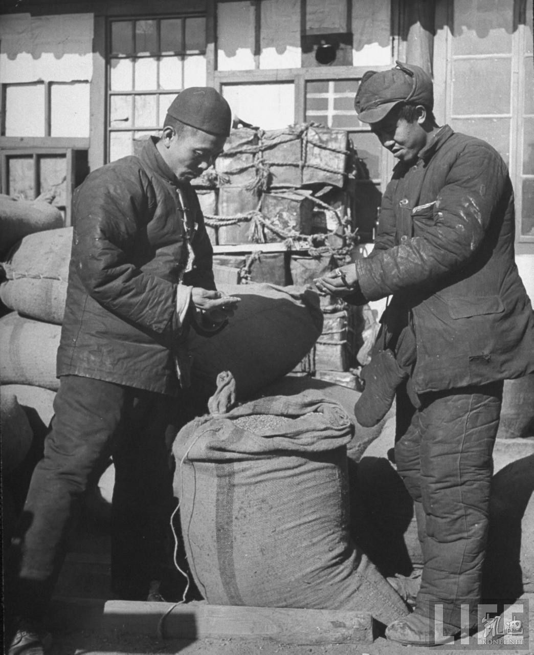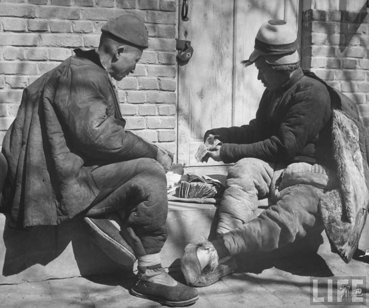 1946年4月,张家口。在家门口坐着数钱交易,这是源自蒙古地区的习俗,张家口是通往蒙古人地区的交通要道。.jpg