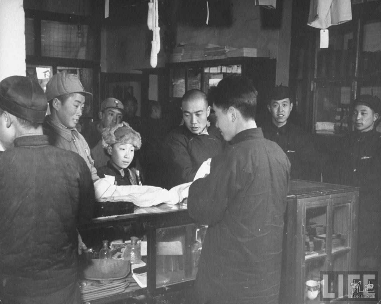 1946年4月,张家口。当地最大的私营裕民百货公司内柜台前,一个中华民国国民革命军第八路军军人正在选购布匹,当人市民在傍边围观。.jpg