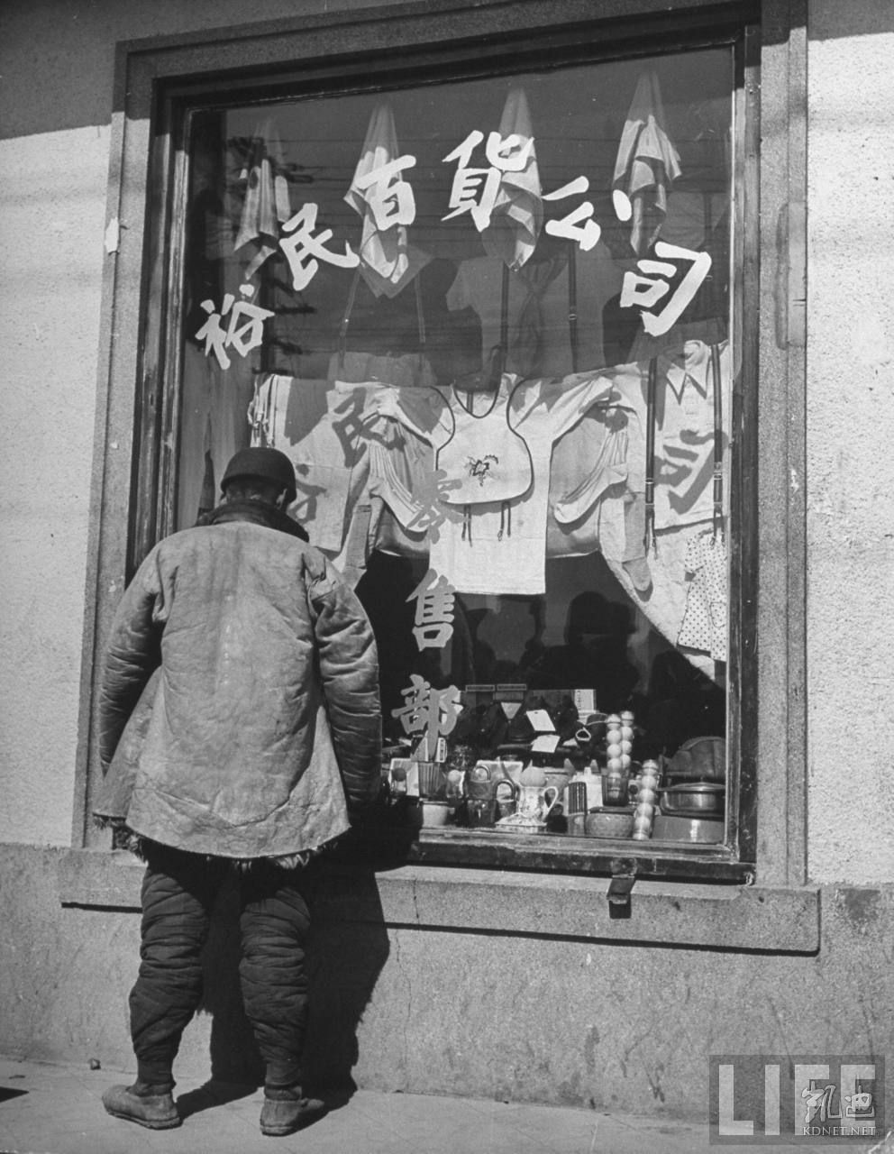 1946年4月,张家口。当地最大的私营裕民百货公司,一个当地人在橱窗前。.jpg