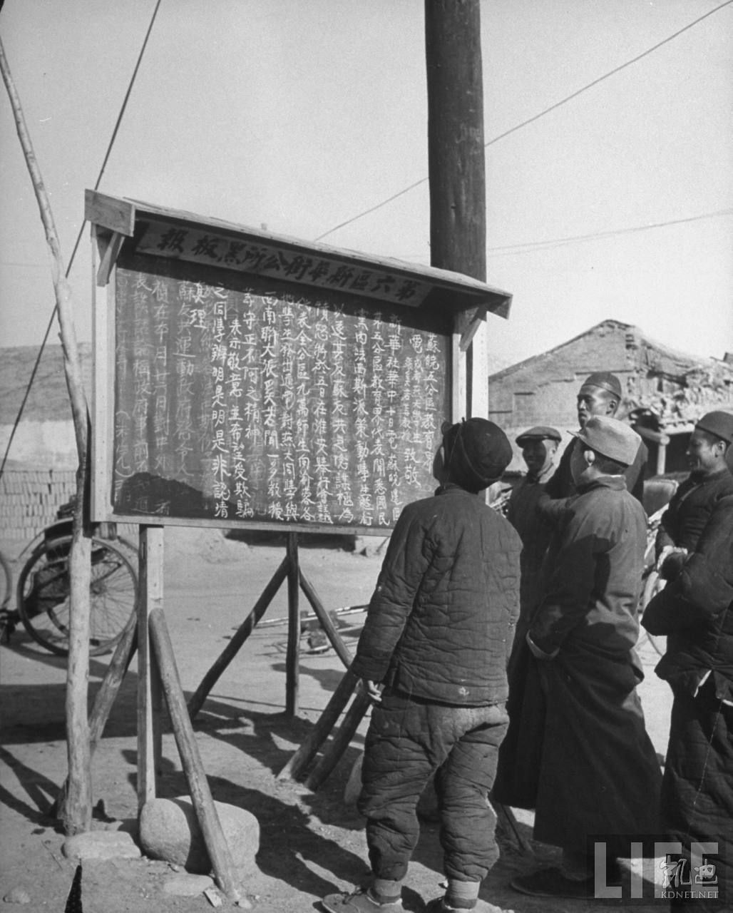 1946年4月,张家口。晋察冀边区第六区新华街公所黑板报,市民在阅读新华社新闻,里面的内容是共产党新四军控制的苏皖第五区教育界组织的集会,反对重庆、成都发生的学生反共反苏的示威,认为是国民党策动学生干的,里面提到燕京大学没参与,有民主人士西南联合大学的张奚若、闻一多劝阻这些学生不要反共反苏。其时,国共两党之间的战争即将开始。.jpg