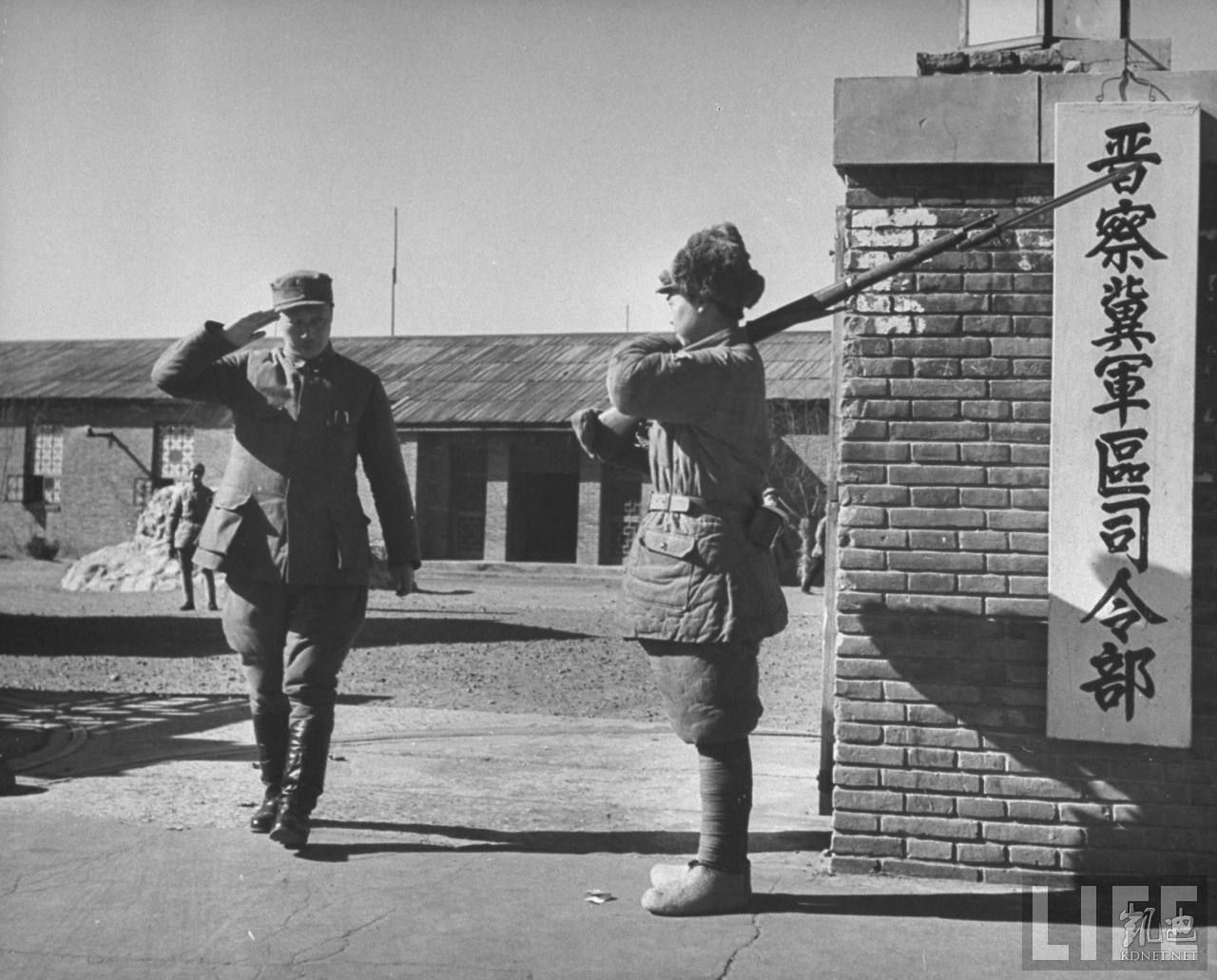 1946年5月,张家口。晋察冀军区司令部大门口。共军少将肖华离开他的办公室,与卫兵行礼。这时共军部队正策划在大同、集宁一线对国军发动攻击,以夺取这两个城市。.jpg
