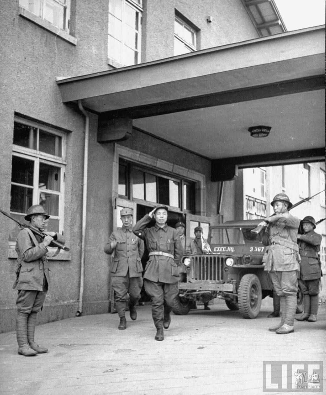 1946年4月,张家口。晋察冀边区首脑聂荣臻在军区司令部门口与卫兵互相敬礼。.jpg