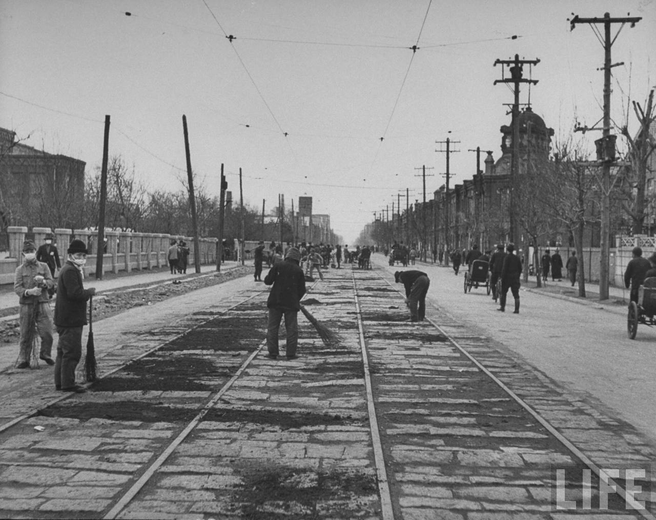 1946年,沈阳。根据联合国决议苏联人撤离后中华民国政府恢复对奉天的治权,街道上日本人被征调进行清扫大街的工作,二战后的重建已经开始。.jpg