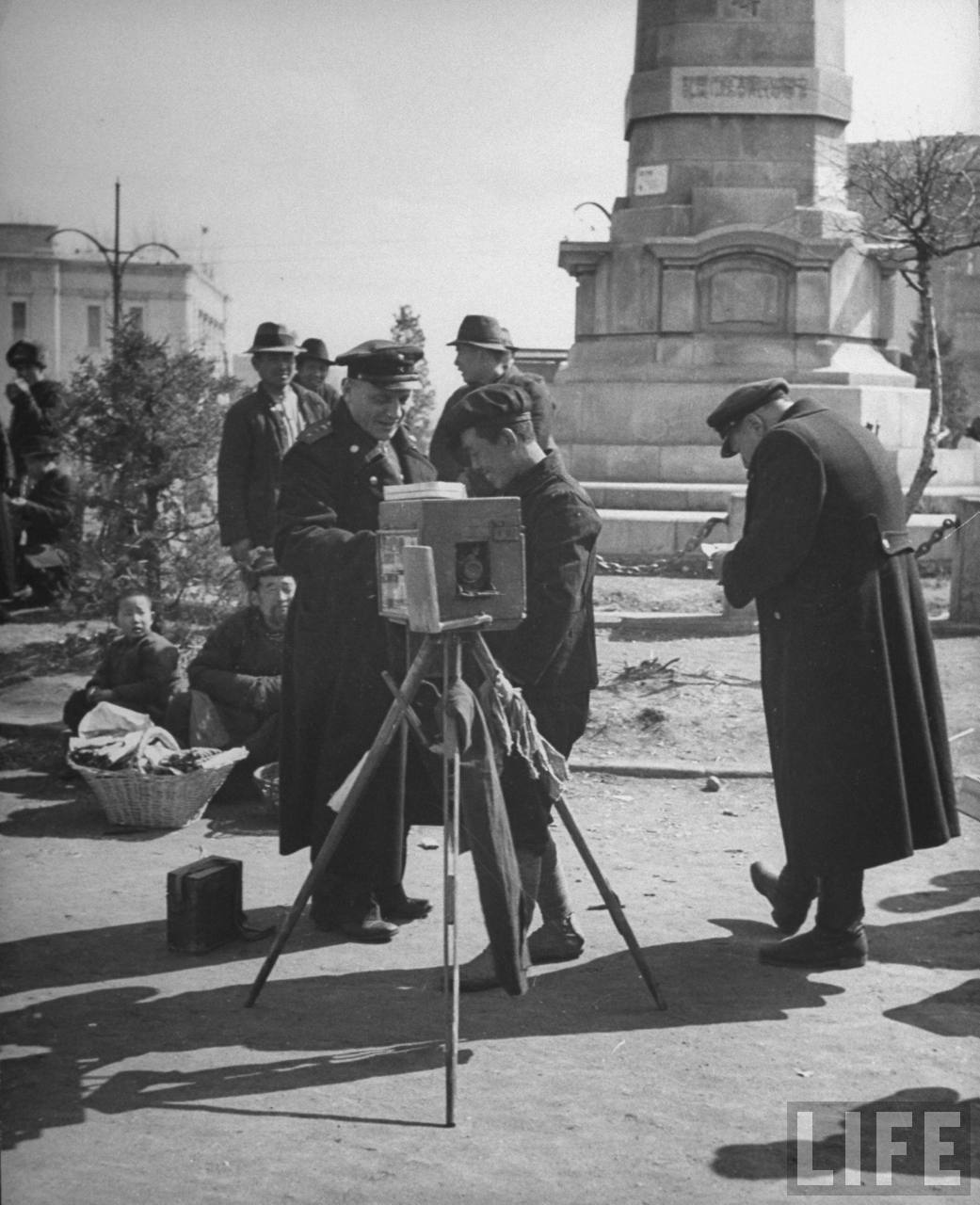 1946年5月,沈阳。沈阳火车站前苏联人管辖时期建的满洲战役纪念碑,一些刚到的中国旅客在好奇地围观。.jpg