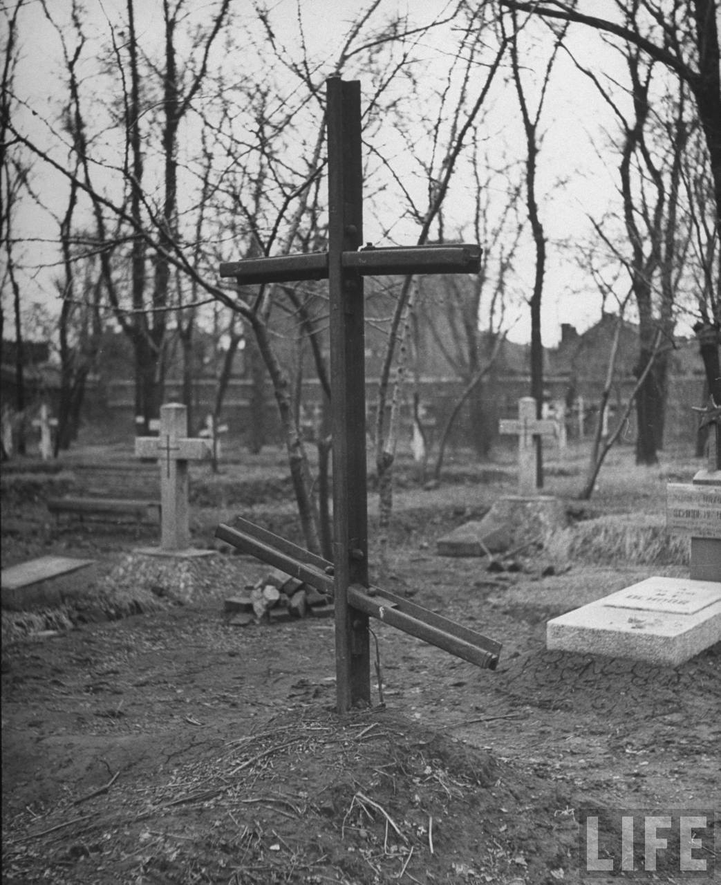 1946年5月,沈阳。东正教墓地,苏联管辖时期很多满洲战役死亡的红军士兵也埋在这里,这个士兵的墓地上的十字架是用的铁轨。.jpg