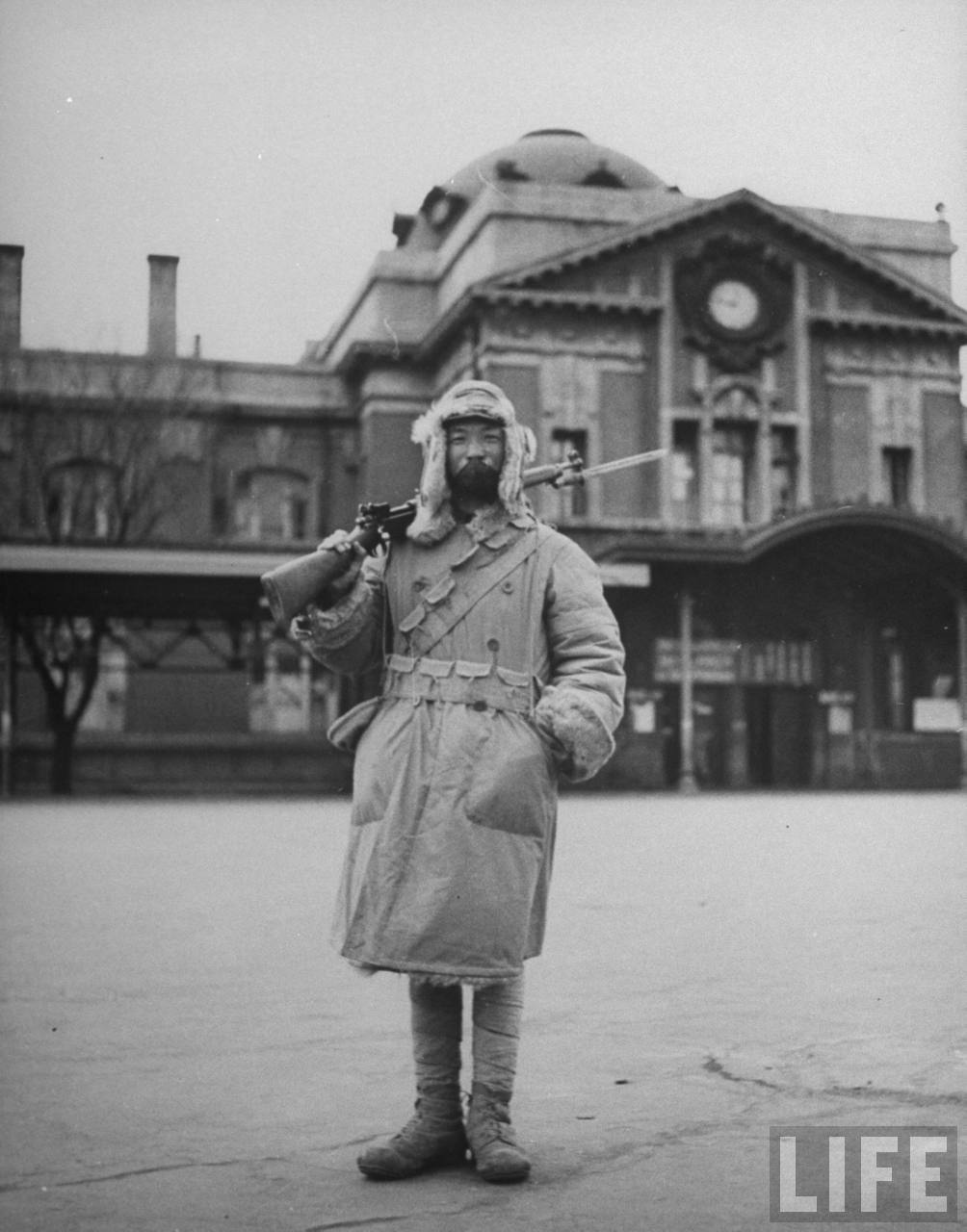1946年5月,沈阳。持枪的中华民国士兵在沈阳火车站执勤,背景的大楼上苏联管辖时期的标语、画像等已经全部扯下。.jpg