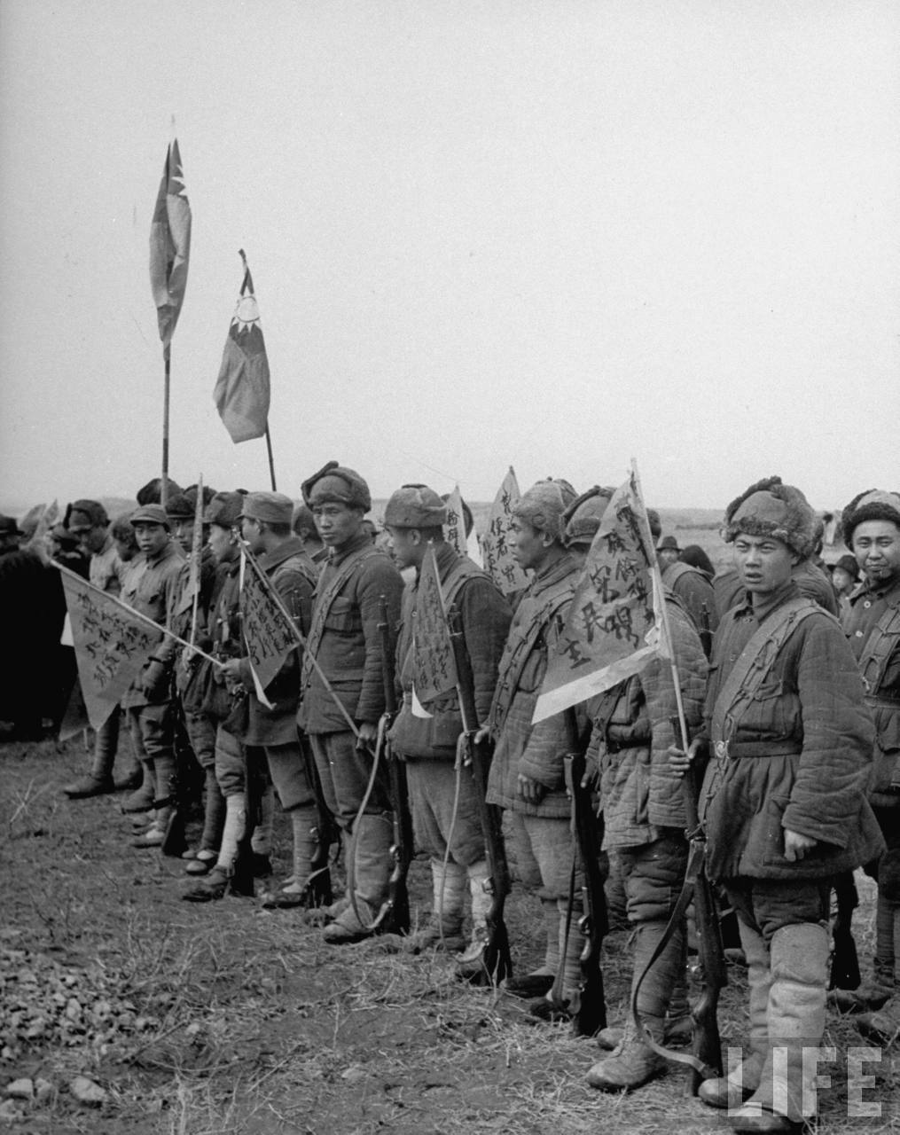 1946年5月,沈阳。机场上欢迎美国军事调停的中华民国国军士兵,标语上写着“肃清东北残余势力,实现自由民主”。.jpg