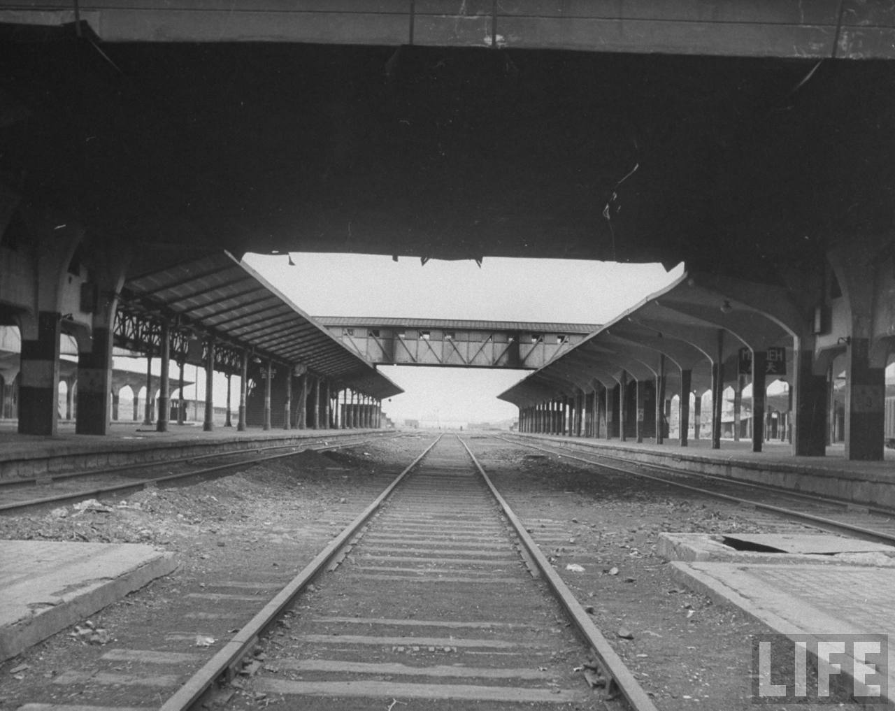1946,沈阳。苏联人刚刚撤走的情景,枕木全部被苏联人挖走,以致铁路无法正常运行,火车站内一片萧条,站台上空无一人,只有“奉天”(沈阳旧名)两个字的牌子空悬在那儿。.jpg