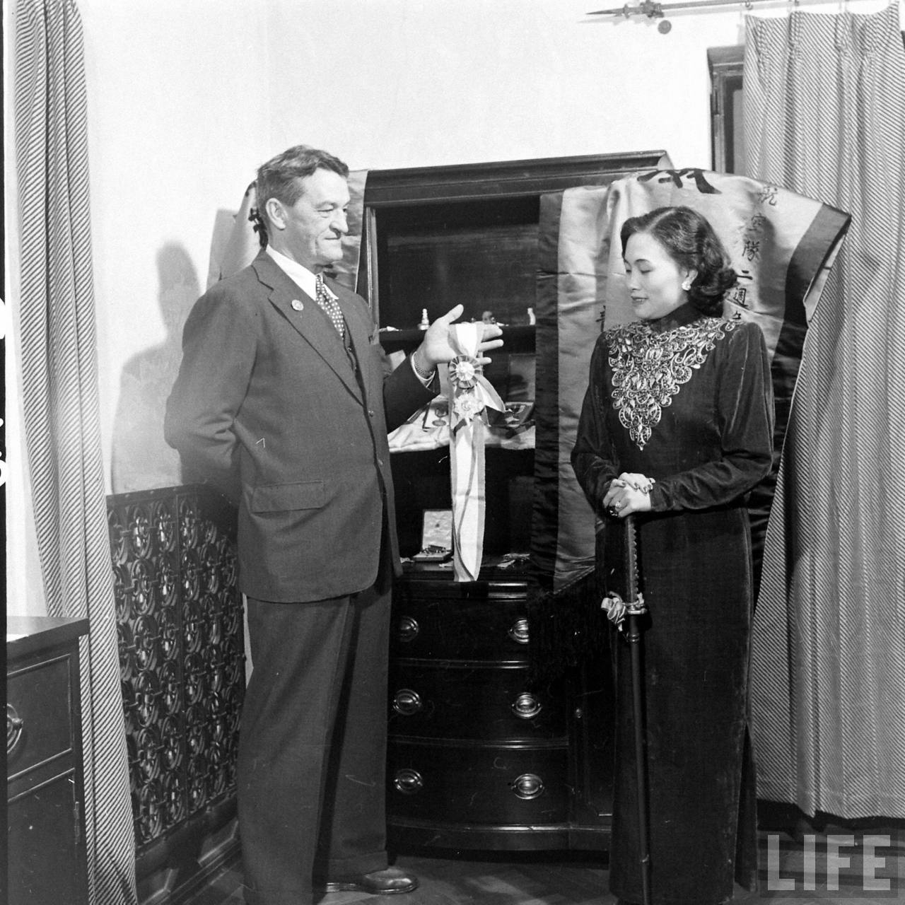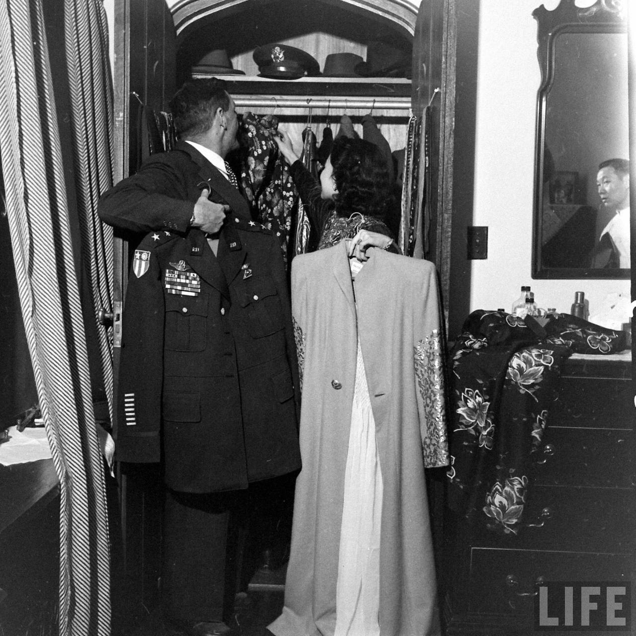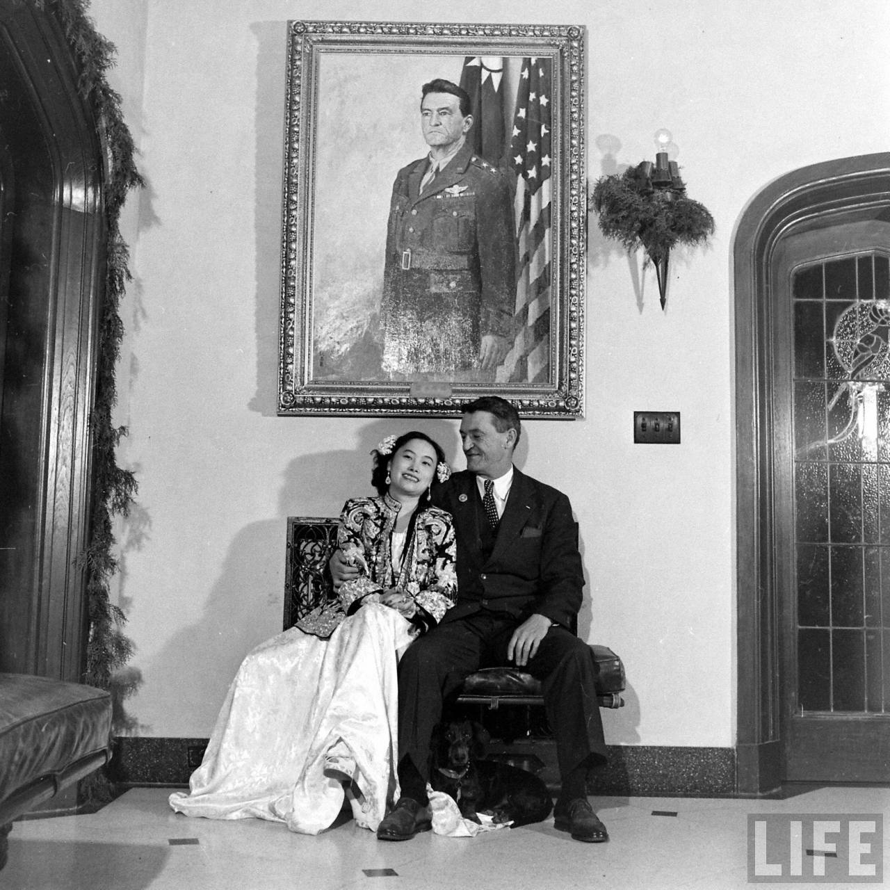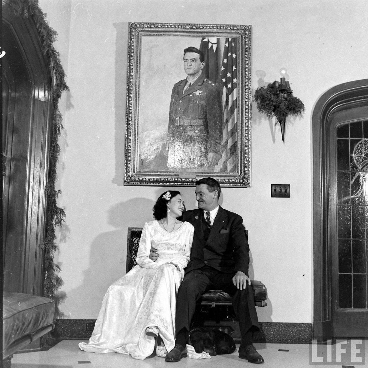 1947年,上海。陈纳德与陈香梅的婚礼。中国人民的真挚朋友陈纳德将军戎马一生为中国人民的抗日战争做出了巨大贡献。宽大的起居室正中墙壁上挂着陈纳德将军身着戎装的巨幅油画像,所有的壁灯都点缀着青翠的松柏枝叶,醒目的是由一千朵白色菊花装饰的大花钟,垂悬于天花板下,清新又繁茂。厅堂和走廊,则摆满了亲友们送的艳丽的花篮花束,除了这铺天盖地的花海,婚礼不见一丝奢华。.jpg